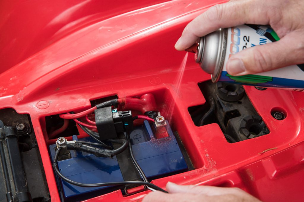 Spray both posts, along with all of the permanent rings with a healthy dose of battery terminal protectant. Don’t over-spray. Be sure to cover all of the metal pieces that could get corroded when faced with a cold and wet winter.